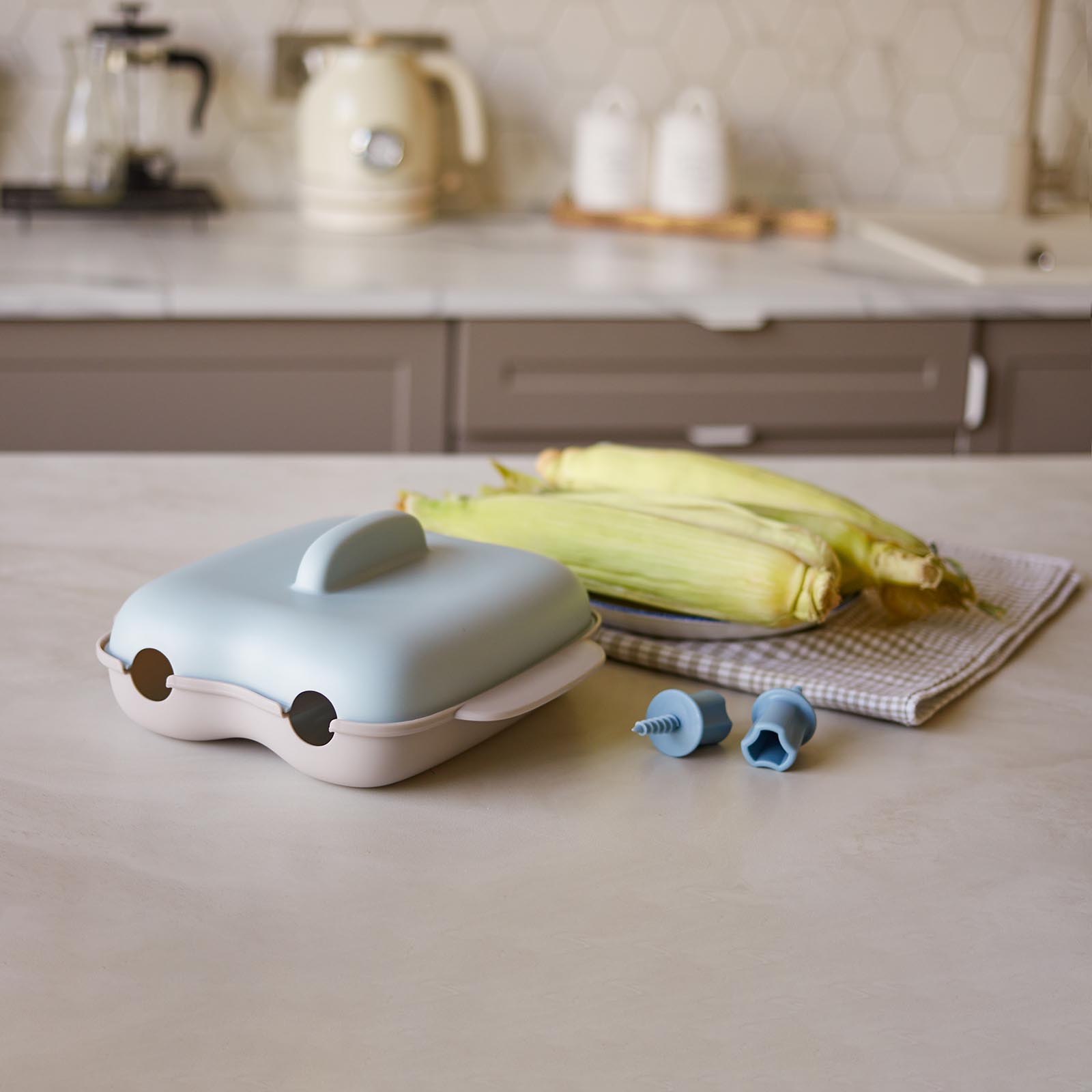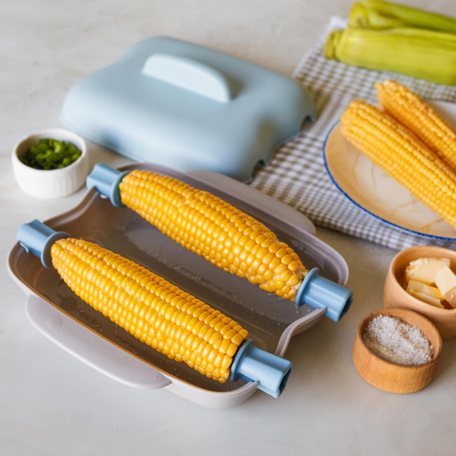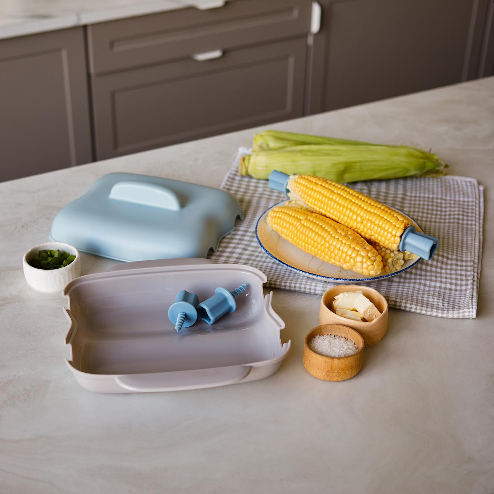 Кукурузоварка MIKU приготовит ароматную горячую кукурузу в обычной микроволновке. Теперь полезный гарнир — дело нескольких минут. В комплекте — специальные держатели, с ними варить, подавать и есть кукурузу еще удобнее.