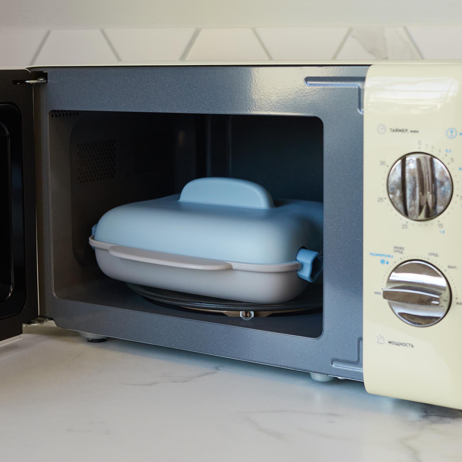 Доставайте из СВЧ-печи с помощью прихваток и обеими руками