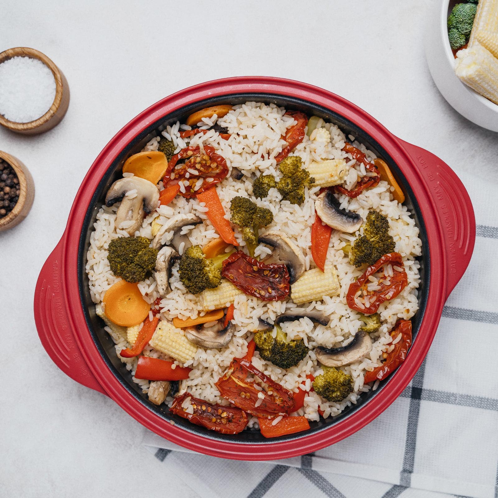 Самая большая форма — для тушения, выпечки и запекания. Она же используется для готовки на пару — залейте немного воды, установите сверху решетку, выложите продукты и накройте крышкой. Пароварка в микроволновке готова!