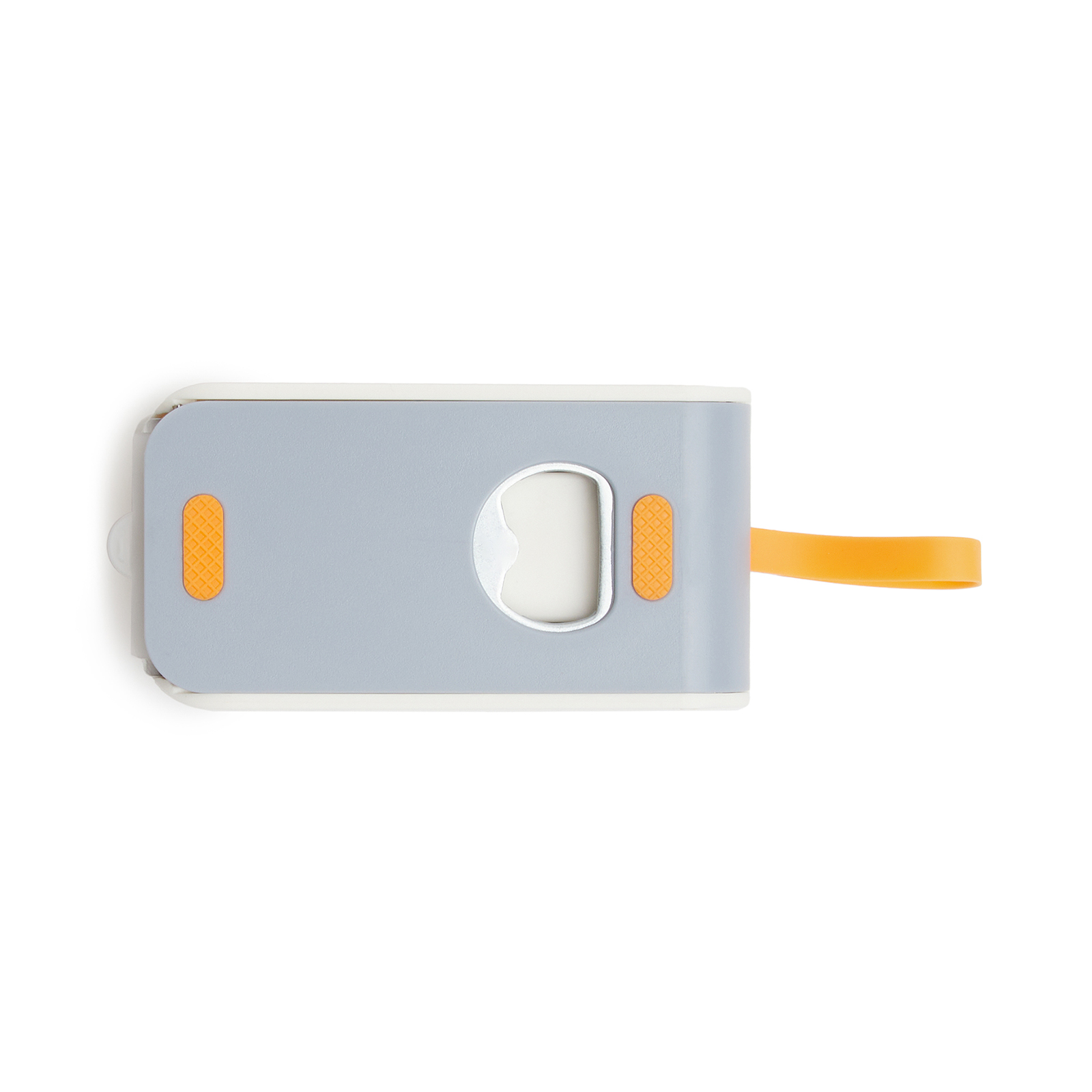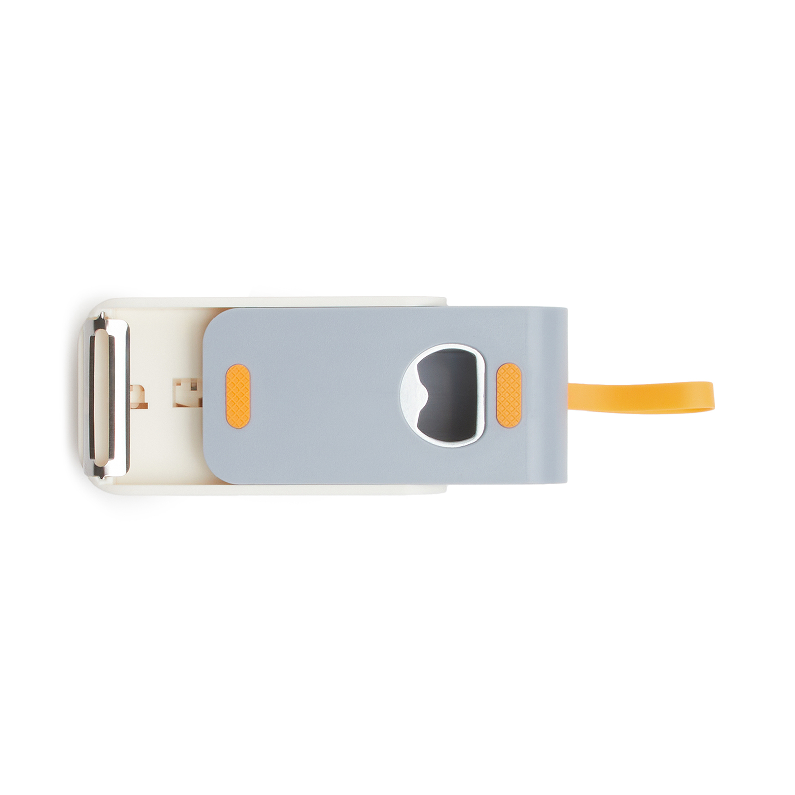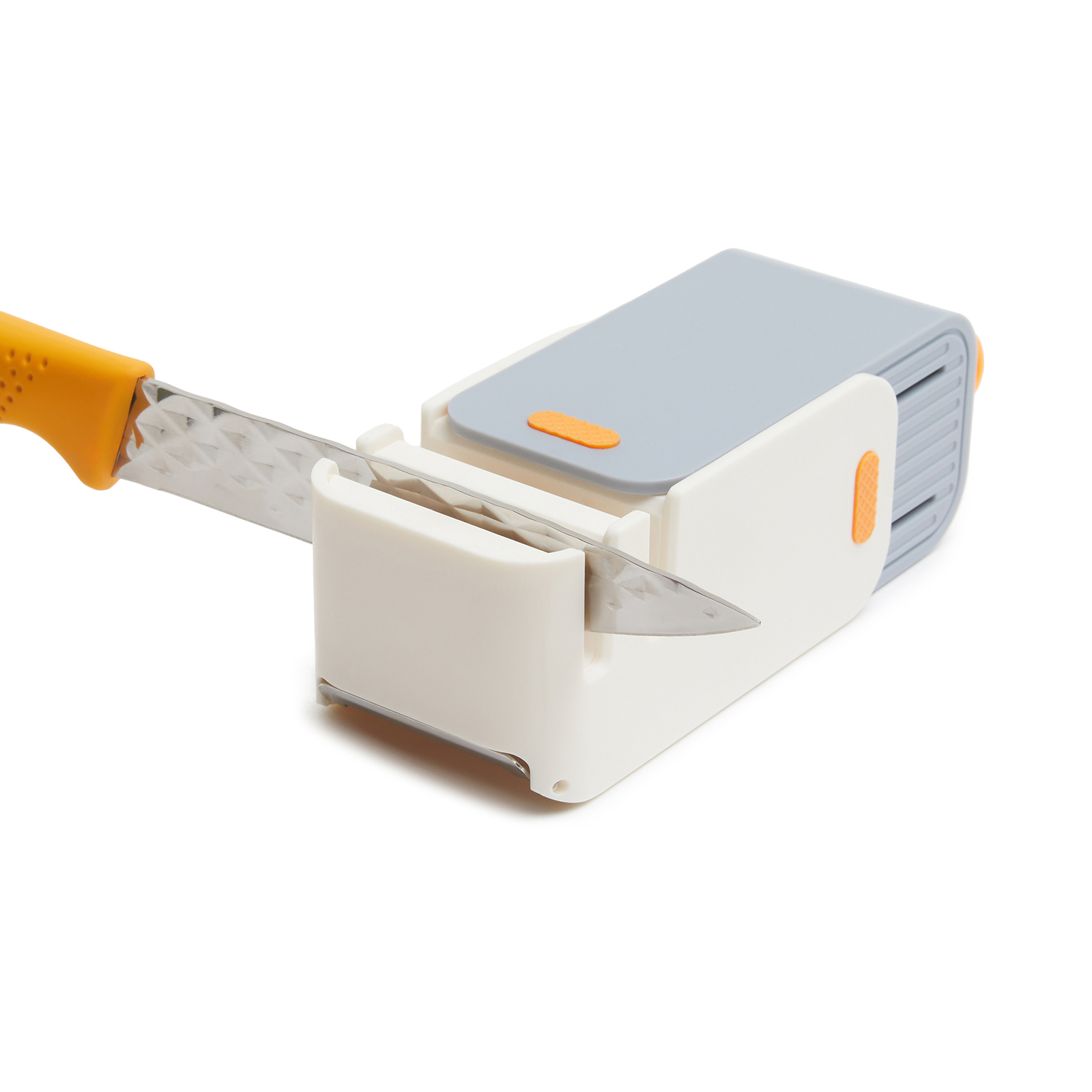Точилка легкая, компактная. Складная конструкция с двумя пазами: для грубой заточки с карбидом вольфрама и для тонкой заточки с керамикой. Основание — нескользящее. На одной из сторон — открывалка для бутылок. Один край оборудован лезвием для чистки овощей.