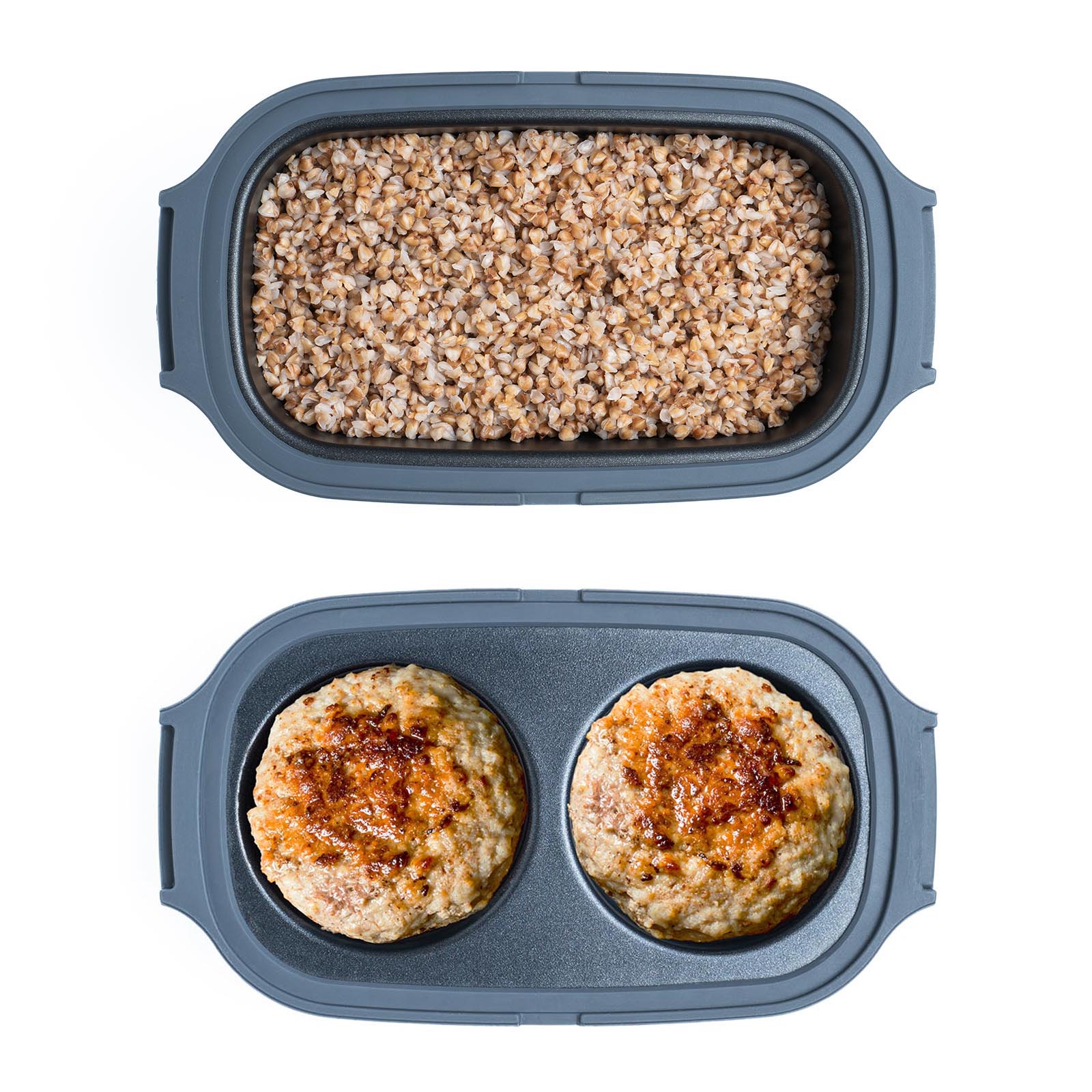 В комплект входит сразу 2 контейнера для разных блюд. Маленький подойдет для котлет или яиц. Большой — для крупы или овощей.