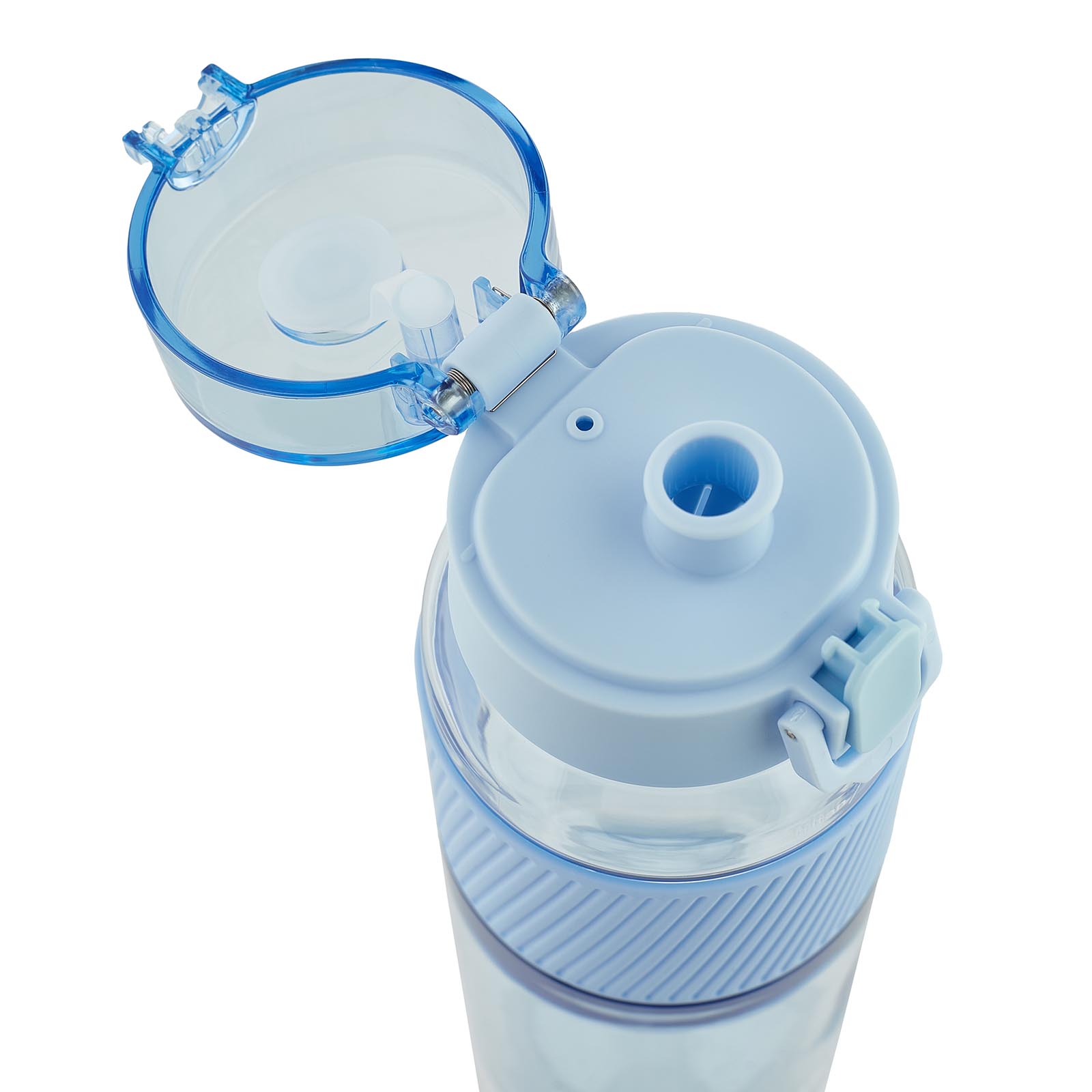 Бутылка сделана из безопасного пищевого пластика. Крышка открывается нажатием кнопки. Замок надежно закрывается и фиксируется скобой — бутылка не откроется в сумке случайно. Надежно и удобно лежит в руке за счет силиконового рукава.