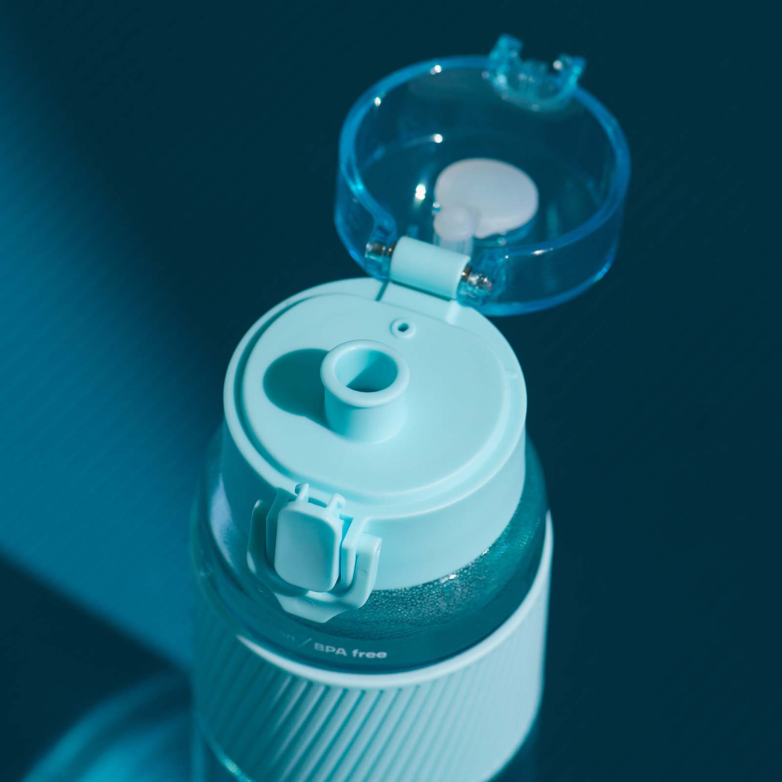 Бутылка сделана из безопасного пищевого пластика. Крышка открывается нажатием кнопки. Замок надежно закрывается и фиксируется скобой — бутылка не откроется в сумке случайно. Надежно и удобно лежит в руке за счет силиконового рукава.