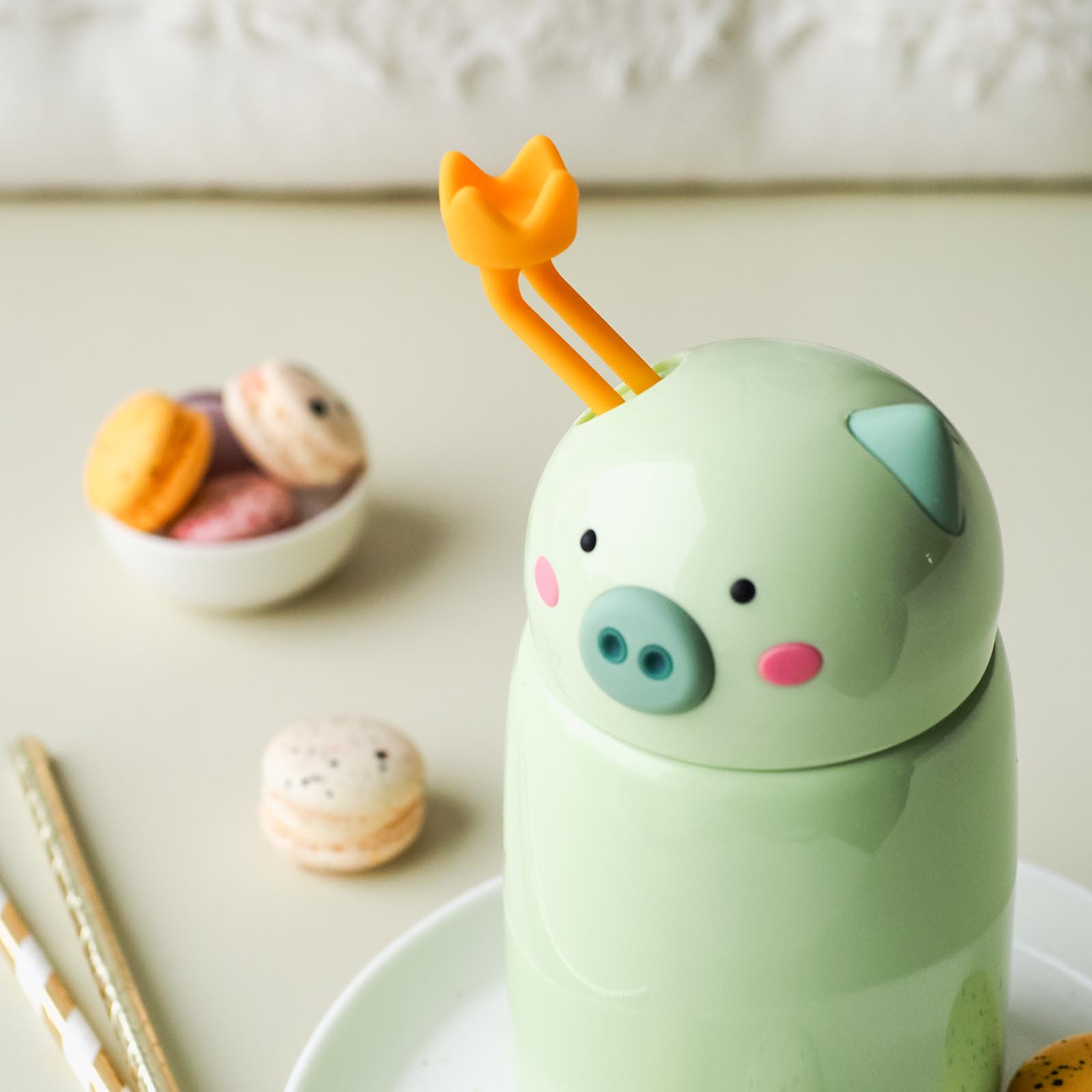 Термос приятно держать в руках благодаря покрытию и мягким вставками на крышке. Голова Свина украшена силиконовой короной с выдвижной веревочкой для переноски.