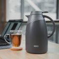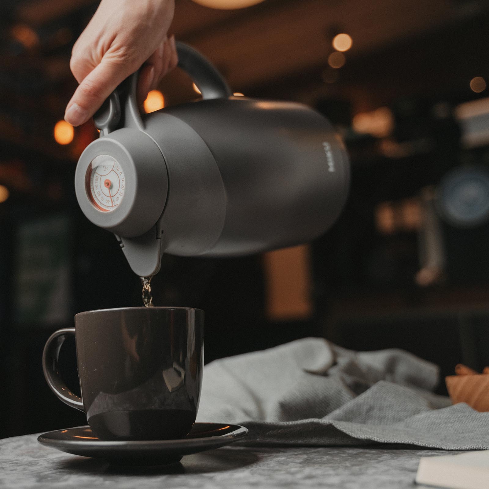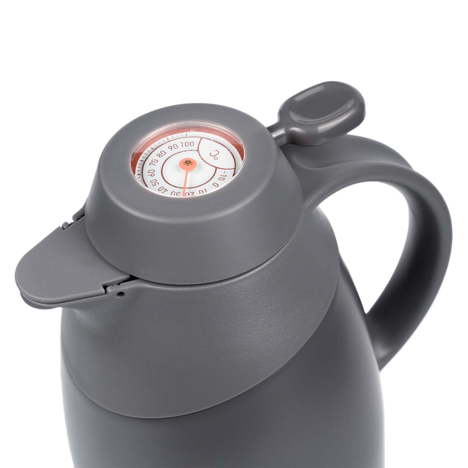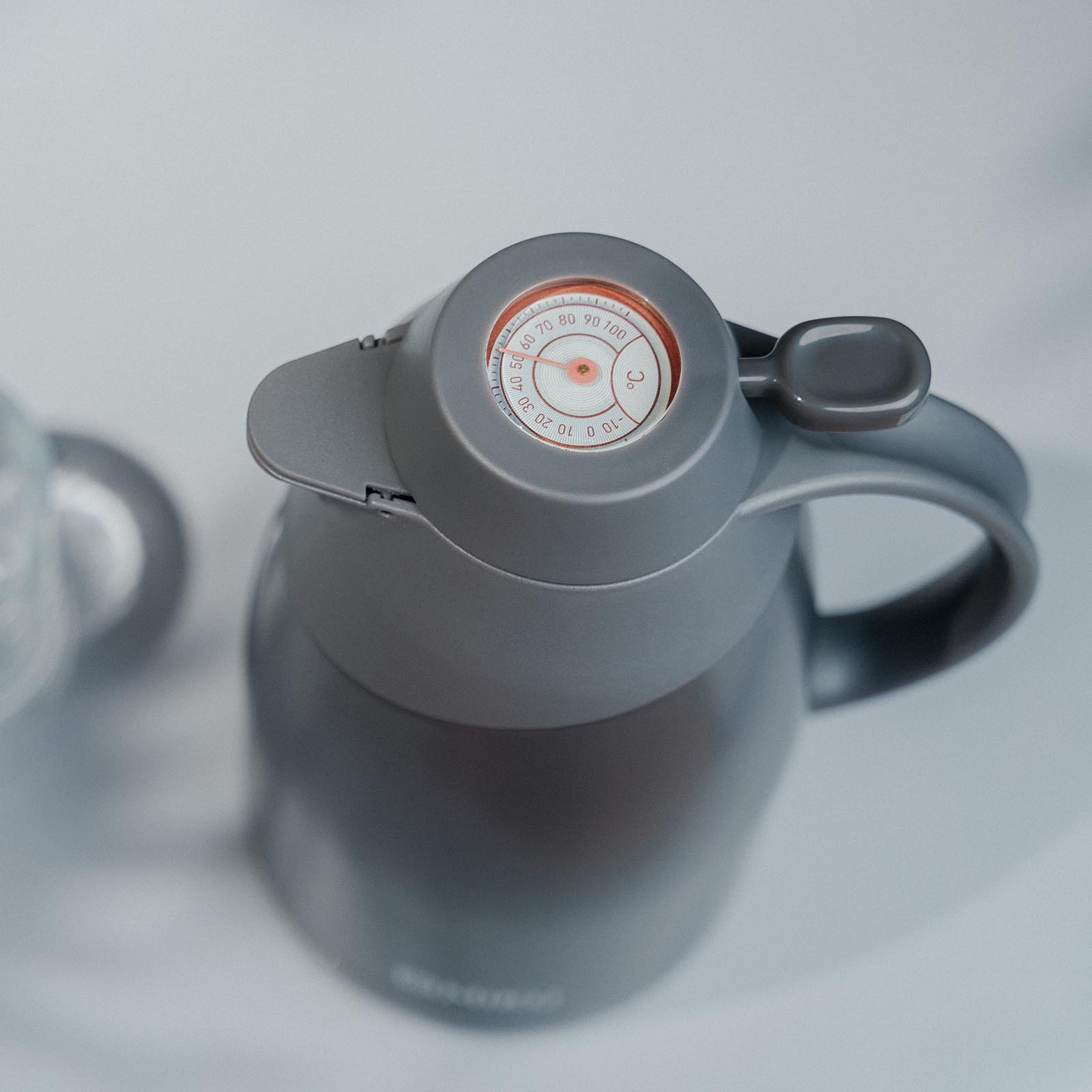 Конструкция продумана до мелочей. Термос сделан из пищевой нержавеющей стали, стенки — с вакуумной изоляцией. Ручка не скользит: даже полный кувшин удобно держать на весу. В крышке — термометр и кнопка подачи напитка.