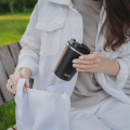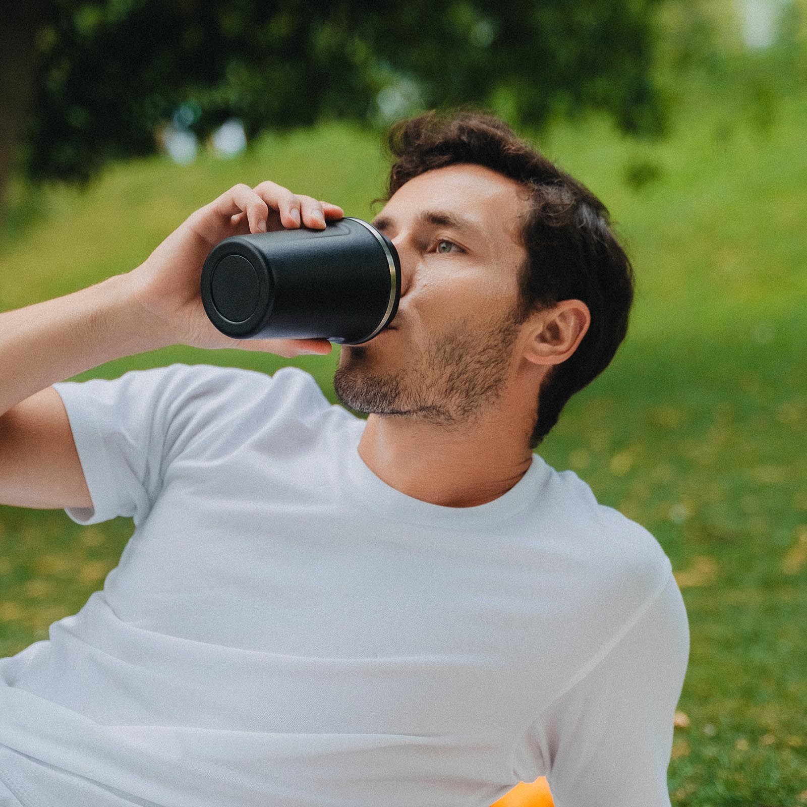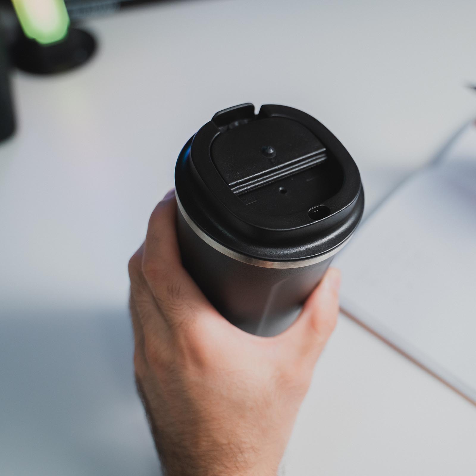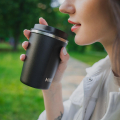 Объем кружки — 380 мл. Она сделана из пищевой нержавеющей стали и сохраняет температуру напитка до 6 часов* за счет вакуумной изоляции стенок. Крышка плотно закручивается, а горлышко закрывается клапаном.