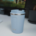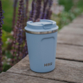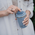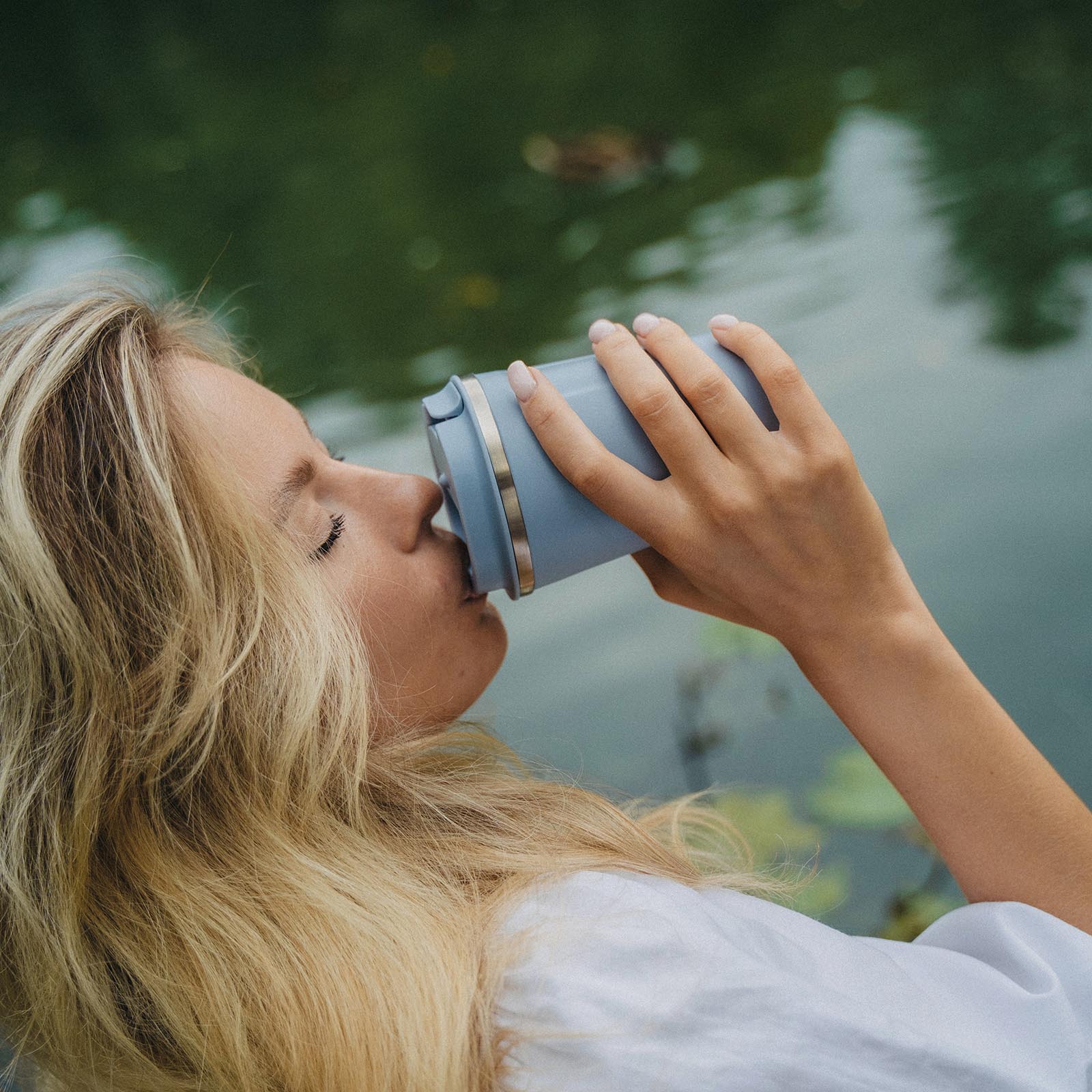 Объем кружки — 380 мл. Она сделана из пищевой нержавеющей стали и сохраняет температуру напитка до 6 часов* за счет вакуумной изоляции стенок. Крышка плотно закручивается, а горлышко закрывается клапаном.