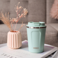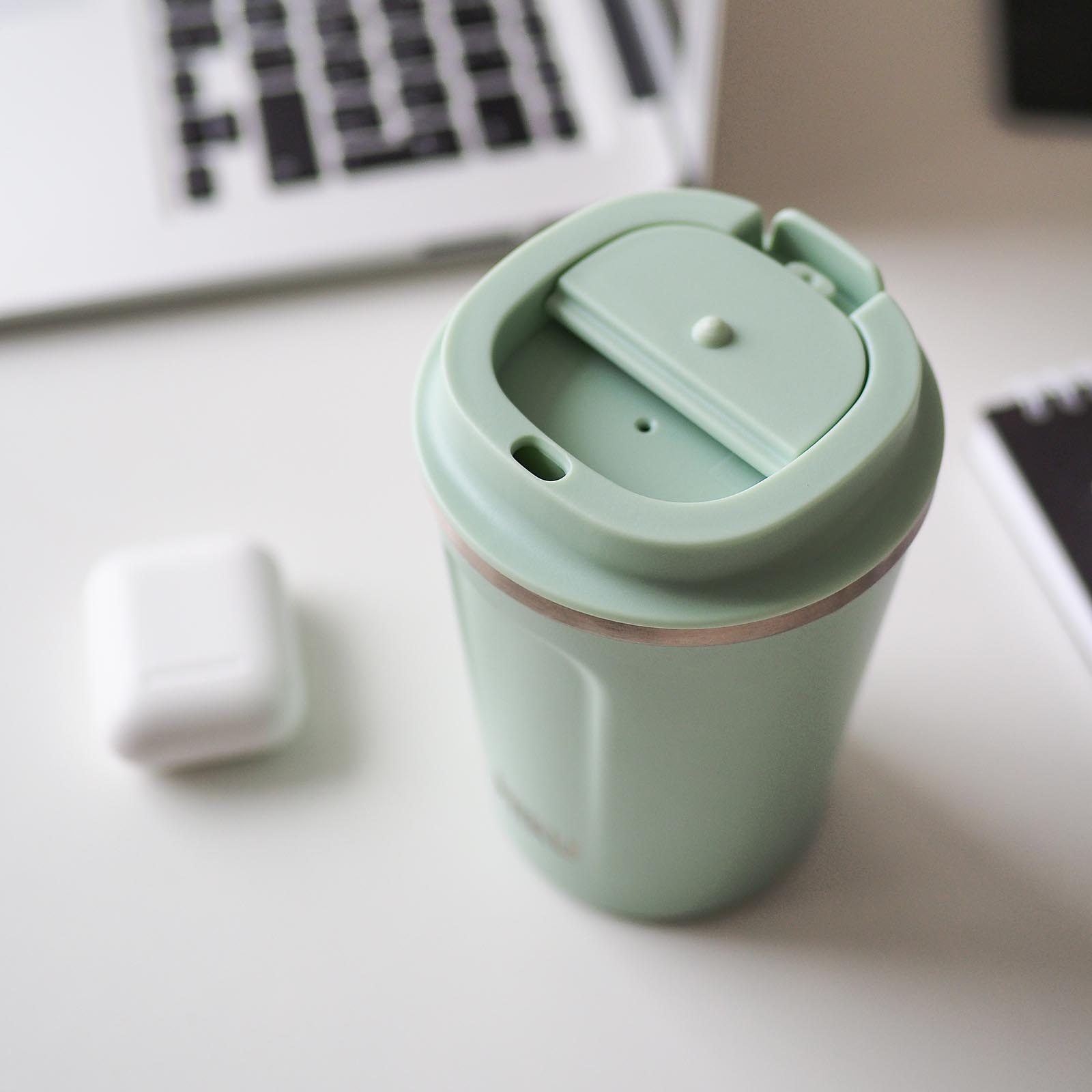 Объем кружки — 380 мл. Она сделана из пищевой нержавеющей стали и сохраняет температуру напитка до 6 часов* за счет вакуумной изоляции стенок. Крышка плотно закручивается, а горлышко закрывается клапаном.