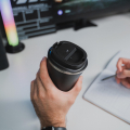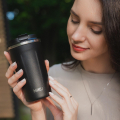 Объем кружки — 510 мл. Она сделана из пищевой нержавеющей стали и сохраняет температуру напитка до 6 часов* за счет вакуумной изоляции стенок. Крышка плотно закручивается, а горлышко закрывается клапаном.