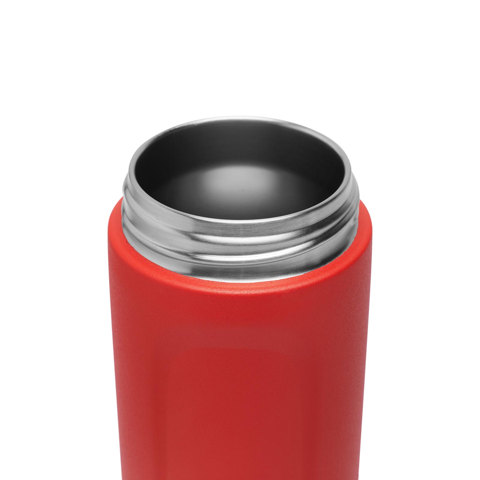 Термокружка сделана из пищевой нержавеющей стали 316L, стенки — с вакуумной изоляцией. Крышка плотно закручивается, а специальный клапан надежно закрывает горлышко.